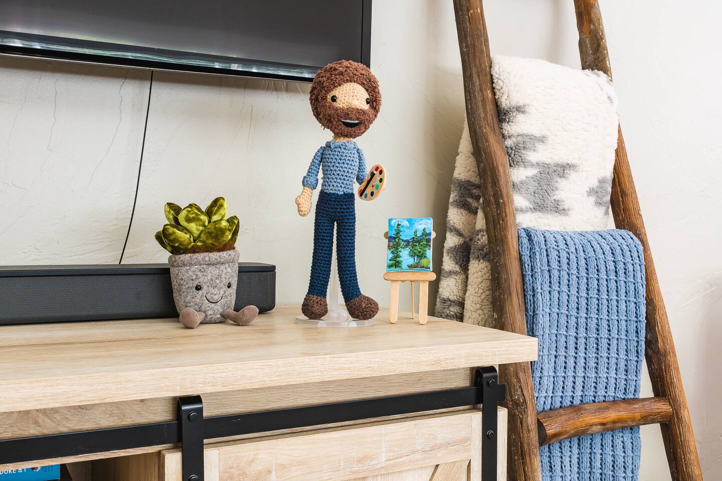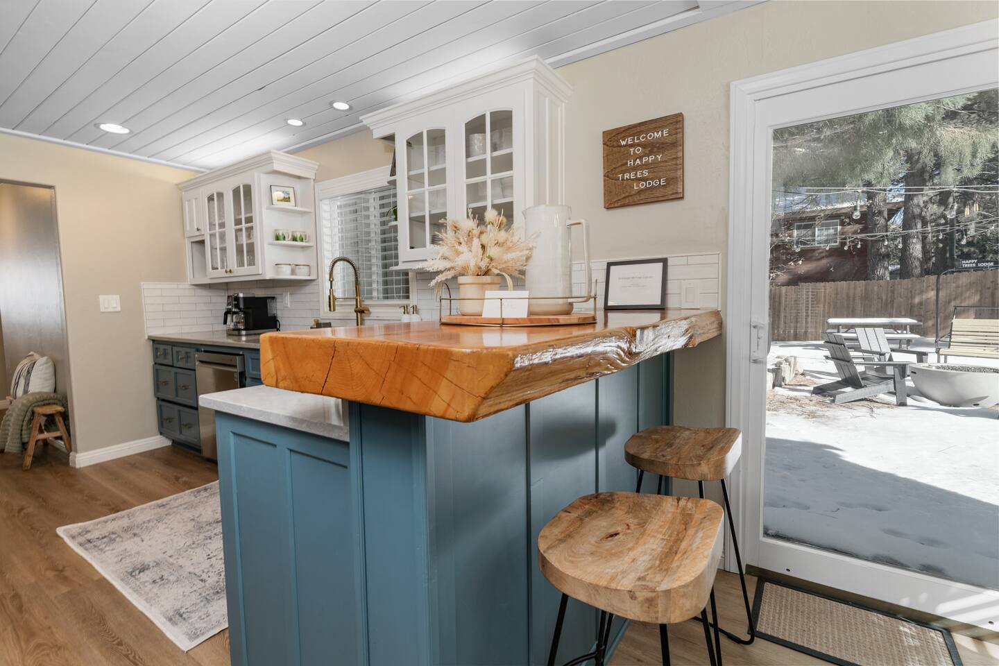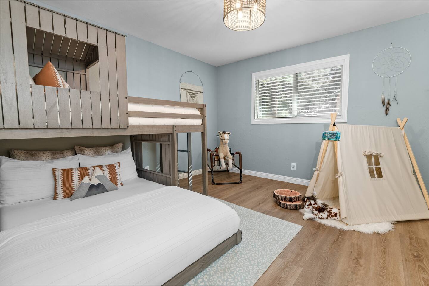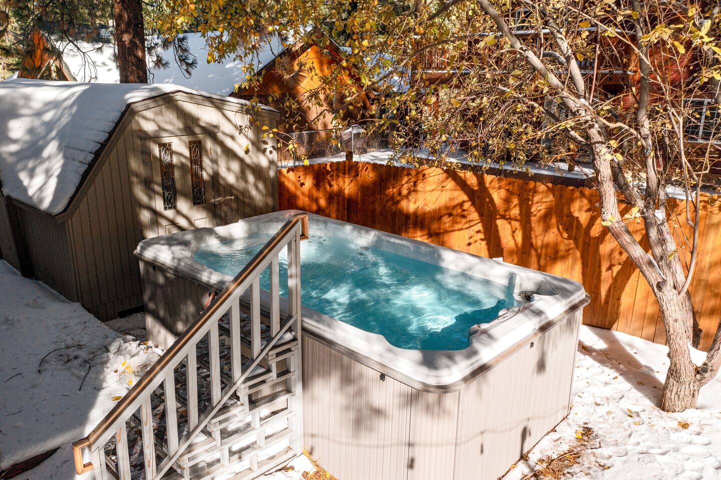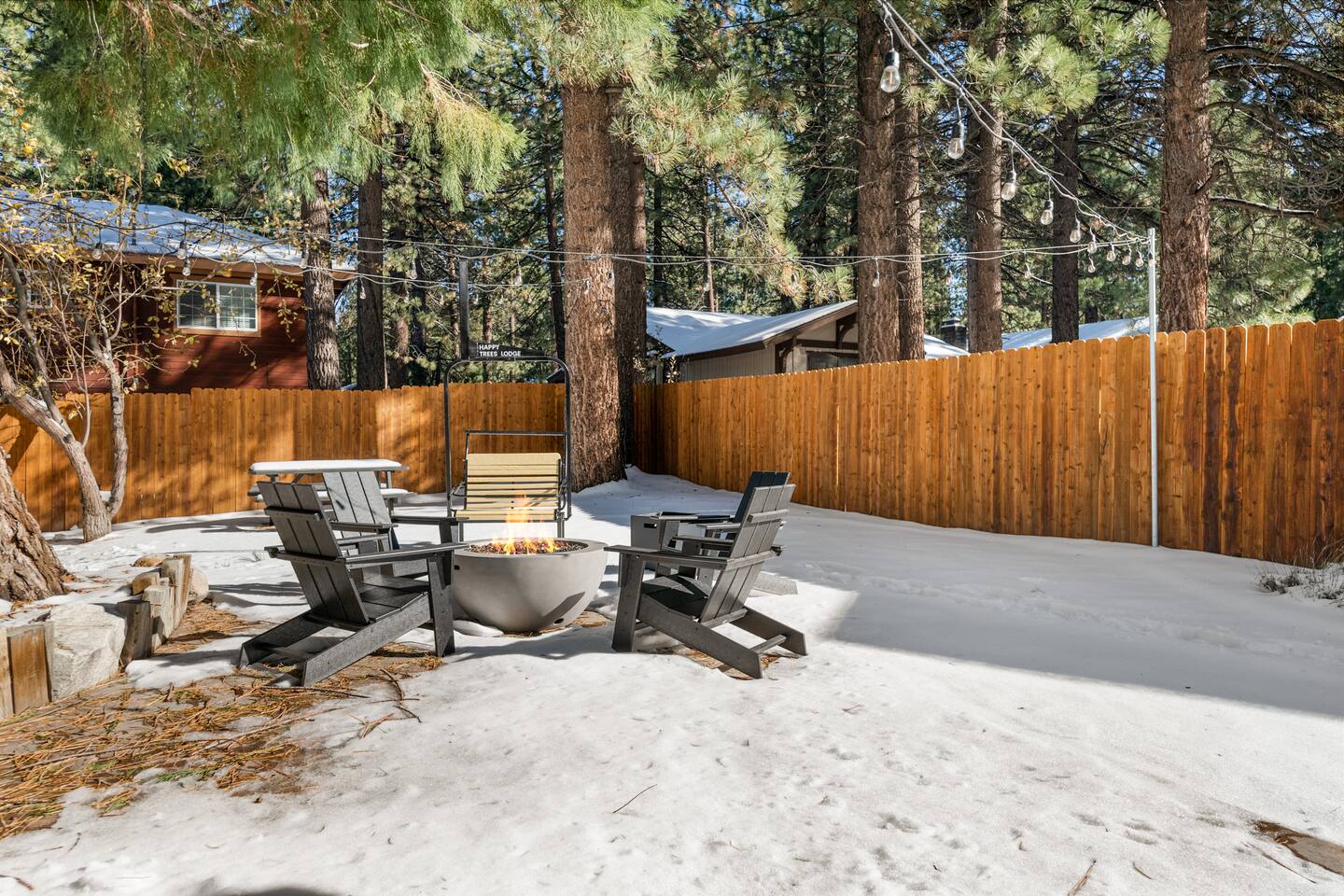 With the cabin surrounded by pine and sequoia trees, and inspired by Bob Ross, we lovingly called it Happy Trees Lodge. Touches of the peaceful painter were added throughout the cabin to create the calm and comfortable setting for our guests. Follow us on IG @happy_trees_lodge for more photos and tours! ------------------- General *Fast 200Mbps Wireless internet with mesh Wifi to provide seamless internet connectivity throughout cabin. *Central heat throughout the cabin controlled by Nest thermostat. *Please note, like most homes in Big Bear this home does not have central AC. *Soft bamboo linens and towels provided with cloud-like comfort for our guests. *Winter Season: 2 space heaters provided for additional comfort to guests. * Summer Season: 1 portable air conditioner, 1 Dyson Pure Cool purifier fans and 2 standard tower fans provided to help keep the cabin cool during the summer time. *Occupancy: Our cabin can accommodate up to 8 adults with a total occupancy of 10. Living Room * A 65" TV with 2.1 channel Sony sound bar / Dolby Digital for movie nights. Amazon Firestick includes complimentary YoutubeTV, Netflix, Disney+ and Hulu. Available for guests to login. *Entertainment console with assortment of books, magazines, and games for our guests that love to read or play. * Combo pool/ping-pong table with bench seating for 6; perfect for guests to sit, hangout, have meals, or play games while sitting next to the fireplace. * Gas burning fireplace controlled by thermostat timer. ------------ Kitchen/Dining Room * Fully stocked with all new dinnerware, utensils, glassware, and quality pots and pans. Spice rack provided. * Instant Pot Pro 10-in-1 pressure cooker/ slow cooker/ sous vide + more, rice cooker, Ninja blender, electric kettle, toaster oven. * Bakeware- baking sheets, baking trays, Pyrex, hand mixer, pie pan, muffin pan, loaf pan, and more. * Gas stove, microwave, and dishwasher. * Dining room table with seating for 8. * Keurig K-cup and full drip coffee maker, mugs, starter coffee pods, ground coffee, sugar, creamer, tea, and hot cocoa provided. * Pre-stocked with paper towels, dish soap, dishwasher tabs, sponges, and garbage bags. * Kids safe utensils and dinnerware also provided. ------------ Bonus Room * 65 in. Smart TV with Amazon Firestick includes complimentary YoutubeTV. Netflix, Disney+ and Hulu. Available for guests to login. * 2 player arcade console with 300 games built in. * Boss Toss bean bag toss game. * Assorted board games and puzzles. * Queen sofa bed (sleeps up to 2). ------------ Garage /Game Room * 2 player arcade style 7 foot long air hockey table. * 2 player double shootout basketball. * 48" foosball table. * 84 Inch Roll And Score Skeeball. * 2 person snow sled and 1 person saucer disc snow sled for outdoor play. * Hooks to hang snowboards and skis. * Table and bar stool seating for 4. ------------ Bathrooms *Two full bathrooms (both bathrooms with shower and tub)— one in the primary bedroom, one in the hallway. * Shampoo, conditioner, body wash, hand soap, lotion and hairdryers are provided in all bathrooms. * Step stool provided in hallway bathroom. ---------------- Bedroom #1 (Primary bedroom) * Traditional king bed. * Rollaway twin Bed (Can be moved to any room, please put back in primary's closet at end of stay). * Double French door leading out to hot tub and deck area. * Walk in closet equipped with hangers and luggage rack. * Full length mirror for getting ready in the morning. * Desk and chair for home office setup. ---------------- Bedroom #2 * Queen bed. * Closet equipped with hangers and luggage rack. * Full length mirror for getting ready in the morning. --------------------- Bedroom # 3 / Bunk-bed room (twin over full) – 2 beds (sleeps up to 3) * Bed 1: Top bunk - twin * Bed 2: Bottom bunk - full * The top bunk can hold 160 pounds max. * Toys include play tent, kitchen play set, rocking horse, children's books, and more. -------------- Laundry * Laundry closet attached to the bonus room, with full-size washer and dryer. * Laundry pods, fabric sheets, and stain remover available for use. * Ironing board, iron, drying rack, dustpan, broom, swifter, and toilet plunger available. -------------- Backyard features: * Privacy Fence around the entire backyard. * A Vision Kamado charcoal grill. * A Charbroil 4 burner propane gas grill with 1 side burner. * Gas lighter and ThermalPro thermometer in kitchen for the grill master vacationer. * Charcoal starter, charcoal, additional propane tank available to guests in small shed near patio sliding door. * Stargaze from the 12 seat jacuzzi swim/hot tub that measures 11' x 13'. * Natural gas fire pit with wrap-around Adirondack seating for 4. * Wooden picnic 6- seater wood bench for outdoor dining. * Newly refurbished ski lift bench- photo moment for you and your family. * 2 Adirondack rocking chairs and table on deck near hot tub. * Corn hole toss and giant Connect 4 games. Frontyard Area: * Cabin located on a secluded street with minimal traffic. * RV Parking on side of driveway. * Level 2 50A J1772 Electric Vehicle EV charger available to guests to charge for free. We provide for babies/toddlers: *Booster chair *Kids plates, bowls, cups, and utensils. *Playmat *Diaper changing pad *Assorted kids books and games The Happy Trees Lodge is family and kid-friendly. We would love for you and your children or friends to make everlasting memories at our cabin. ----- Be sure to follow IG @happy_trees_lodge for updates and tag us during your visit. ----- Guests will have access to the entire home and garage, with exception to the outside storage shed.